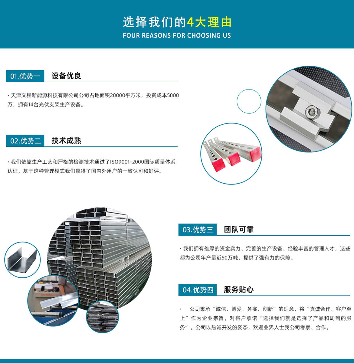 天津文程新能源科技有限公司成立于2021年,是專注于集中式、分布式、漁光互補和農光互補等清潔能源發(fā)電的綜合性企業 公司是集設計、研發(fā)、生產、制造為一體的綜合型企業。公司占地面積20000平方米,注冊資金5000萬元整。公司坐落于華北鋼鐵重鎮--大邱莊,距天津市區50公里、鄰104和205國道及京滬高速,交通十分便捷。 本公司擁有三個生產車間,其中兩個冷彎型鋼車間,一個鋅鋁鎂型鋼車間,擁有自動冷彎成型機10條,自動數控沖孔機10條以及焊接加工等設備。主要生產產品有:太陽能光伏支架、各種規(guī)格的C/Z/U型鋼、抗震支架、管廊支架及整套配件等。
